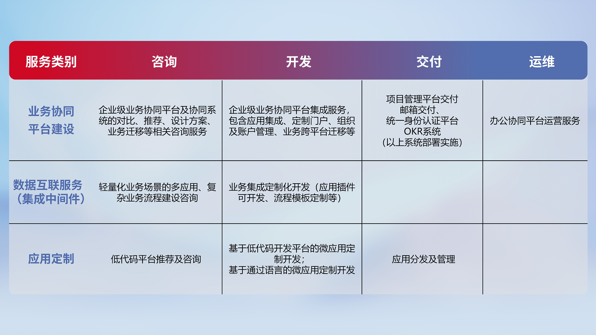 针对钉钉、、、、企微、、IDaas等平台级产品提供产品的规划、、方案、、、交付、、、、定制化开发等服务,,实现如统一协同办公、、、智能客户服务、、、混合会议管理、、、智能数据查询、、、、等业务场景,,实现数字化转型。。。